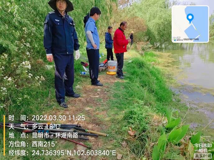 自2022年3月7日以来,区水务综合执法大队每天派出两组执法人员对我区滇池(含湿地)及主要入湖河道开展垂钓规范管理和相关法律法规宣传工作。截至2022年3月30日,累计出动执法人员537人次、车辆46辆次、快艇34艇次,劝离钓鱼人员1568人次,销毁违法垂钓鱼竿1374根,放生垂钓野生鱼类190.5kg,发放各类禁渔宣传资料2450余份。
